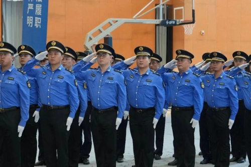 队伍会操比拼现场紧张有序,比拼包括整理着装、立正、稍息、停止间转法、齐步走、正步走、跑步走、敬礼等内容,由专业评委分别进行打分,同时,以随机抽选的方式,对镇街城管队伍队列会操情况进行了检验。