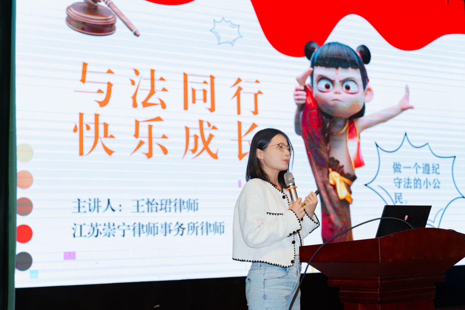 来自江苏崇宁律师事务所律师王怡珺律师,结合小学生的认知特点,利用精心制作的PPT,将《中华人民共和国宪法》《中华人民共和国未成年人保护法》《中华人民共和国预防未成年人犯罪法》中与孩子们生活学习息息相关的条款,融入到一个个生动的法治小故事中。课堂围绕校园欺凌、网络安全、交通安全、隐私保护等热点问题,深入浅出地讲解了“是什么、为什么、怎么做”,现场互动频频,有奖问答环节更是激发了同学们的参与热情,笑声与掌声不断。