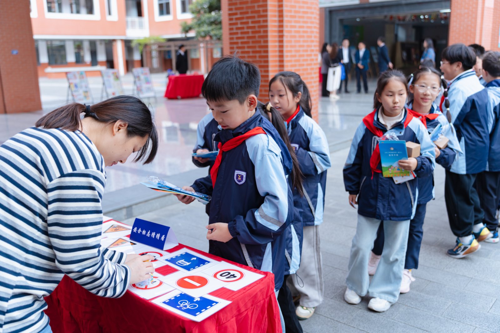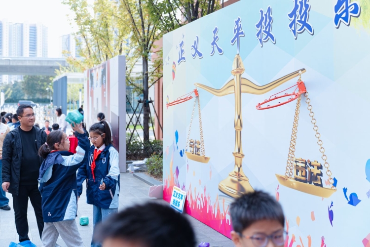 “法治小课堂”结束后,在广场上开展了有趣的“法治游园会”。游园会现场人头攒动,气氛热烈。法治漫画展板区展示了学生们创作的法治主题画作,充满童真与想象力;“法律知识转转乐” 和“安全标志猜猜看” 摊位前,同学们在游戏中巩固了法律与安全知识;“正义天平投投乐” 游戏中,孩子们通过投掷沙包,直观地辨别了守法与违法行为;最受欢迎的莫过于“我是小法官/小律师”角色扮演合影区,同学们身着迷你法官袍、律师袍,手持法槌,在模拟法庭背景前拍照留念,体验了一把守护公平正义的庄重与神圣。整个游园会采用集章打卡的形式,学生们手持集章卡穿梭于各个摊位之间,在轻松愉快的氛围中潜移默化地接受了法治熏陶,集满印章后兑换的奖品更是为此次活动留下了美好的纪念。