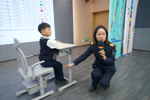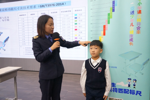 活动中,卫生监督员围绕课桌椅与学生脊柱健康、坐姿养成的密切关系,向师生系统讲解课桌椅对青少年脊柱生长发育的重要影响,详细解读课桌椅相关法律法规和卫生标准,明确不同身高学生对应的桌椅型号选择规范。为让师生直观掌握科学选配方法,监督员现场让学生上台演示身高测量、桌椅选择、坐姿调整等实操步骤,通过互动体验、对比讲解,帮助师生理解 “合适桌椅 = 健康坐姿” 的核心要点,引导师生自觉养成选择适合身高的课桌椅。
