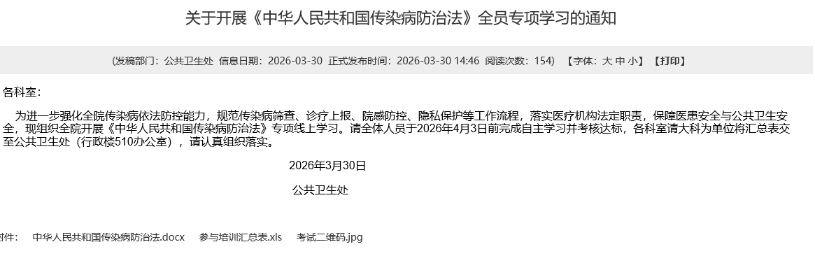 一是组织《中华人民共和国传染病防治法》专题学习考核。通过OA系统发布学习资料,部署全院各科室有序开展集中学习与自主学习,确保每位医务人员深刻领会法律条款内涵,熟练掌握传染病防治法定职责与要求。学习结束后,组织全院统一考核,严格检验学习成效,推动法律知识入脑入心,切实提升医务人员依法履职能力。
